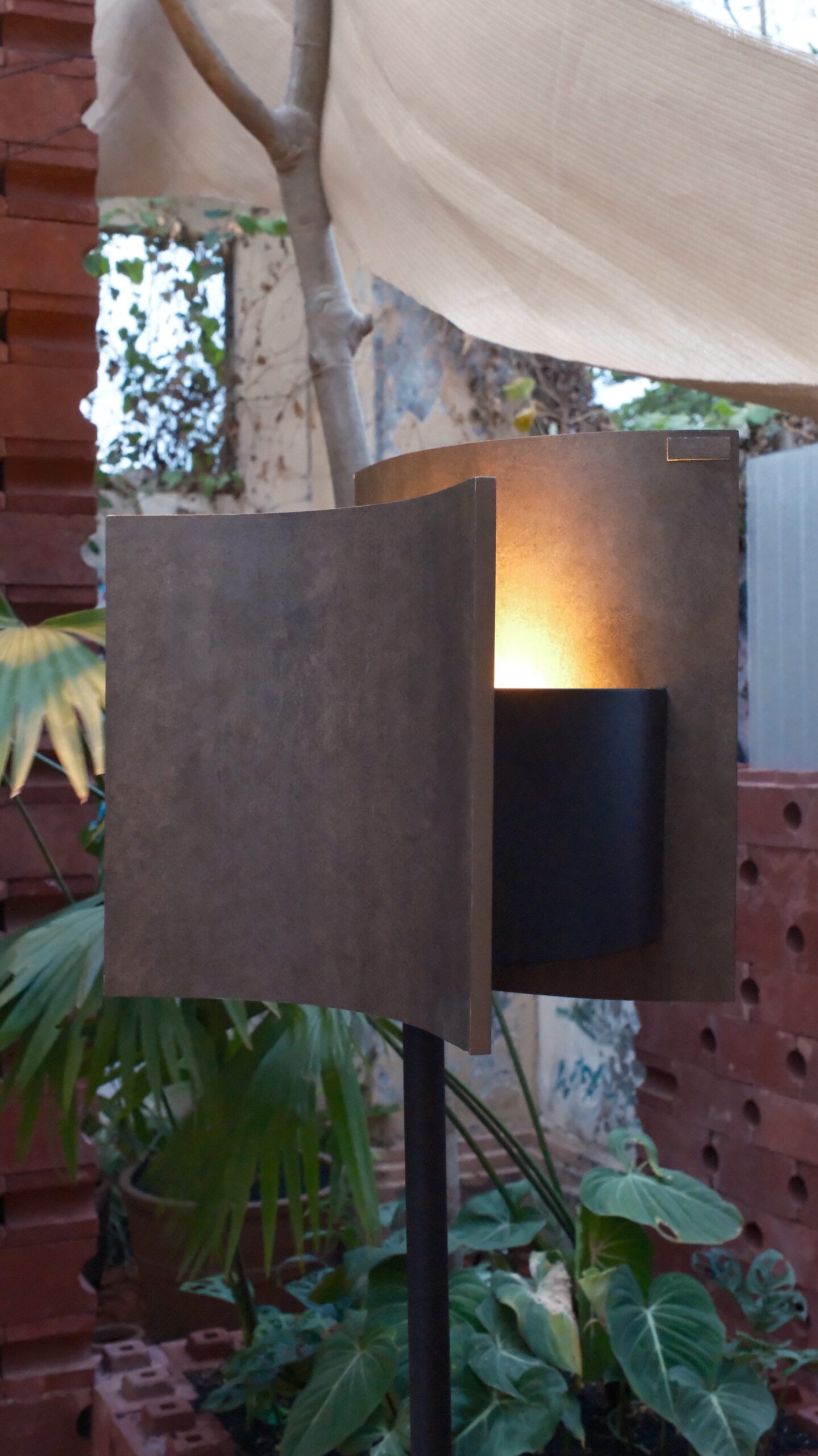 Featuring an inverted design, this lamp reimagines the conventional form. Instead of a circular shade enclosing the bulb, the interior is turned outward revealing what is usually hidden and turning the inside into the visible expression.